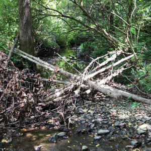 Prior to the project, there was considerable erosion in a channel that receives flow from the parking lot. Three riffles were installed to stabilize 200 feet of stream reach.