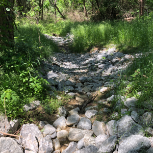 Prior to the project, there was considerable erosion in a channel that receives flow from the parking lot. Three riffles were installed to stabilize 200 feet of stream reach.